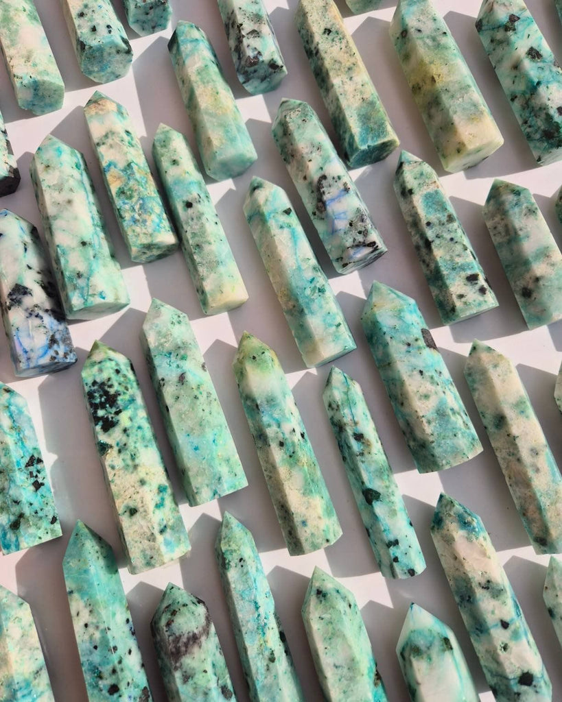 Phoenix stone is a mixture of Quartz, Chrysocolla, Dioptase, Azurite & Manganese (not all may be present)