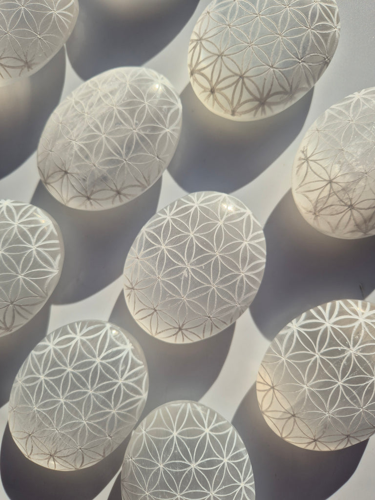 Selenite Palm Stones Flower of Life